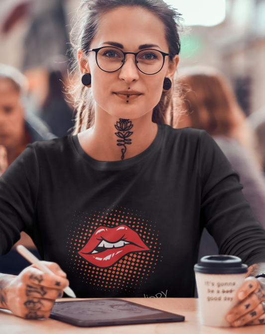 70s inspired lips long sleeved t-shirt with "feeling lippy" slogan. Small through to 2XL