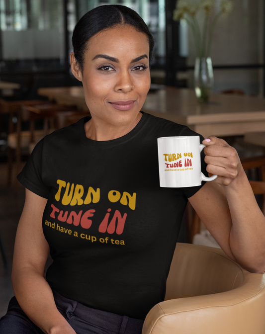 70s inspired Turn On, Tune In and have a cup of tea t-shirt. Great gift for tea lover. Small through to 3XL.
