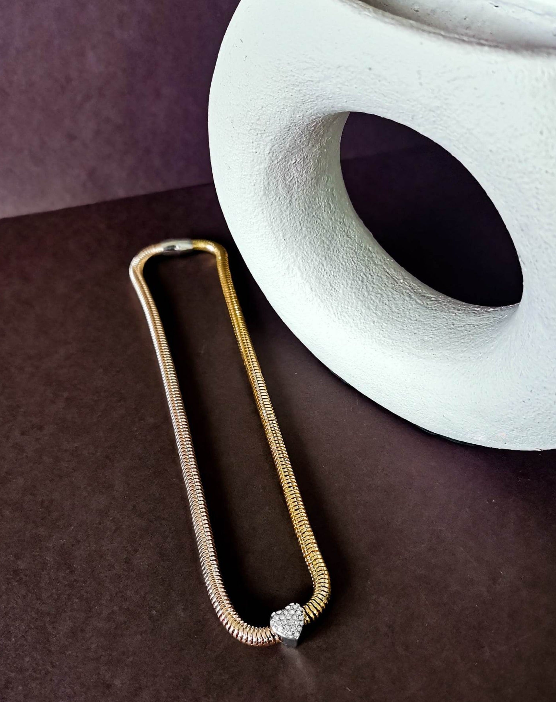A crystal heart is flanked by rose gold tone and yellow gold tone. This unusual and chic necklace has magnetic fastening for ease of putting on/taking off.
