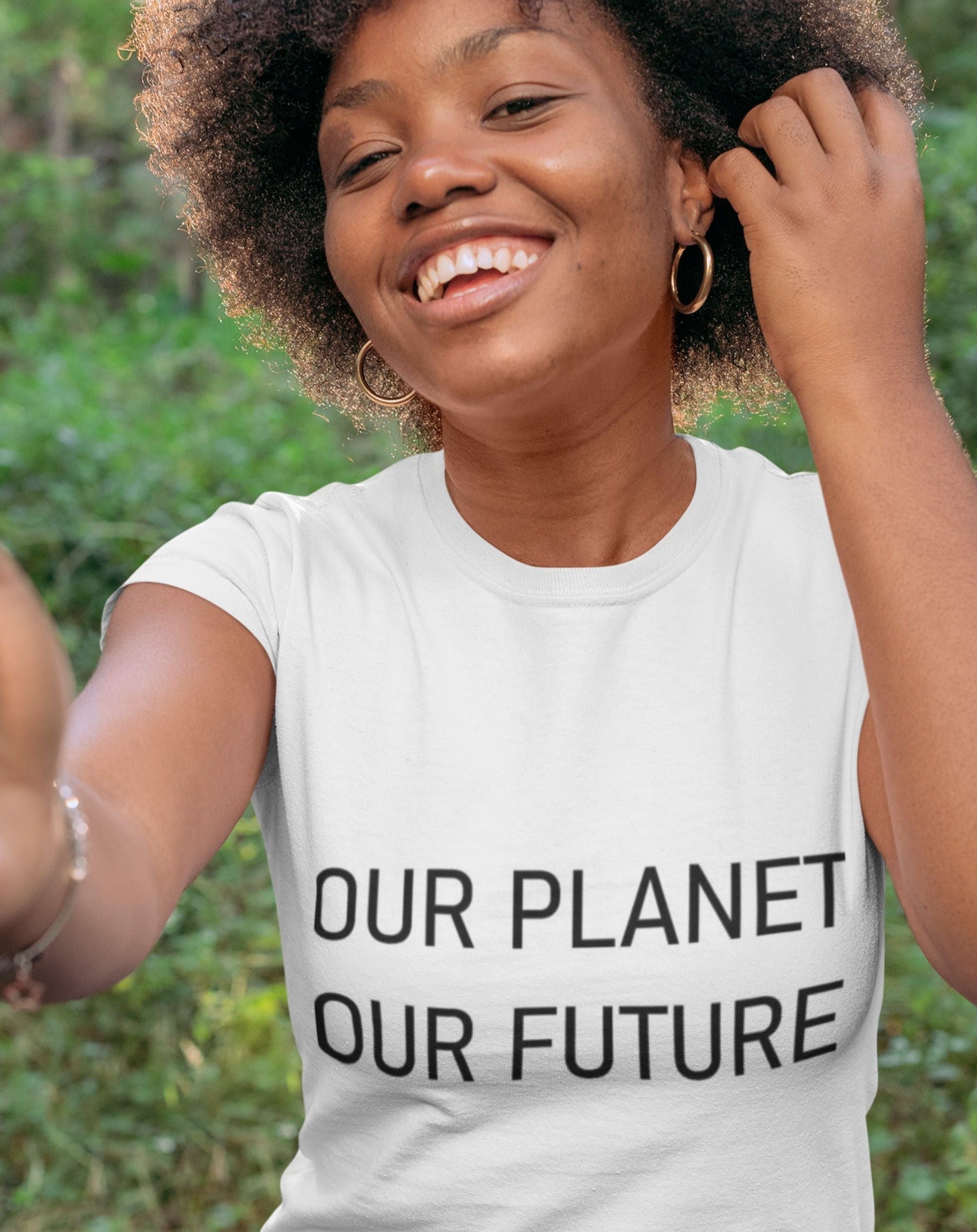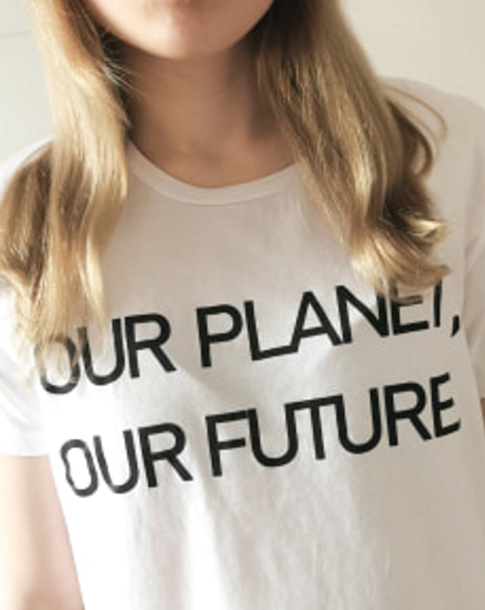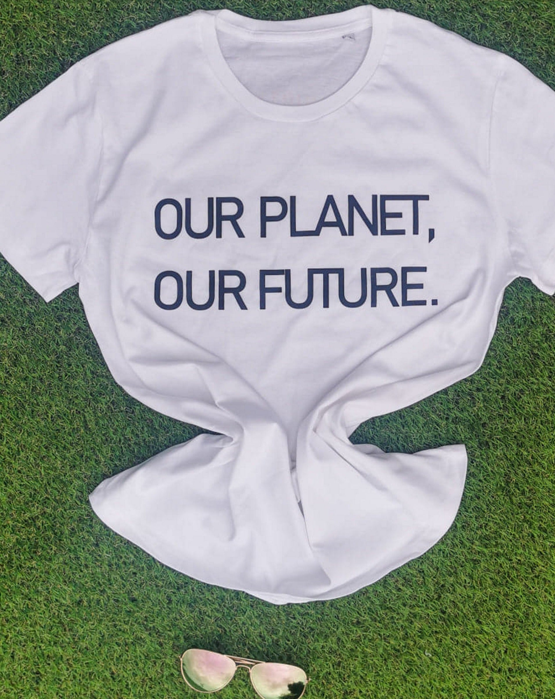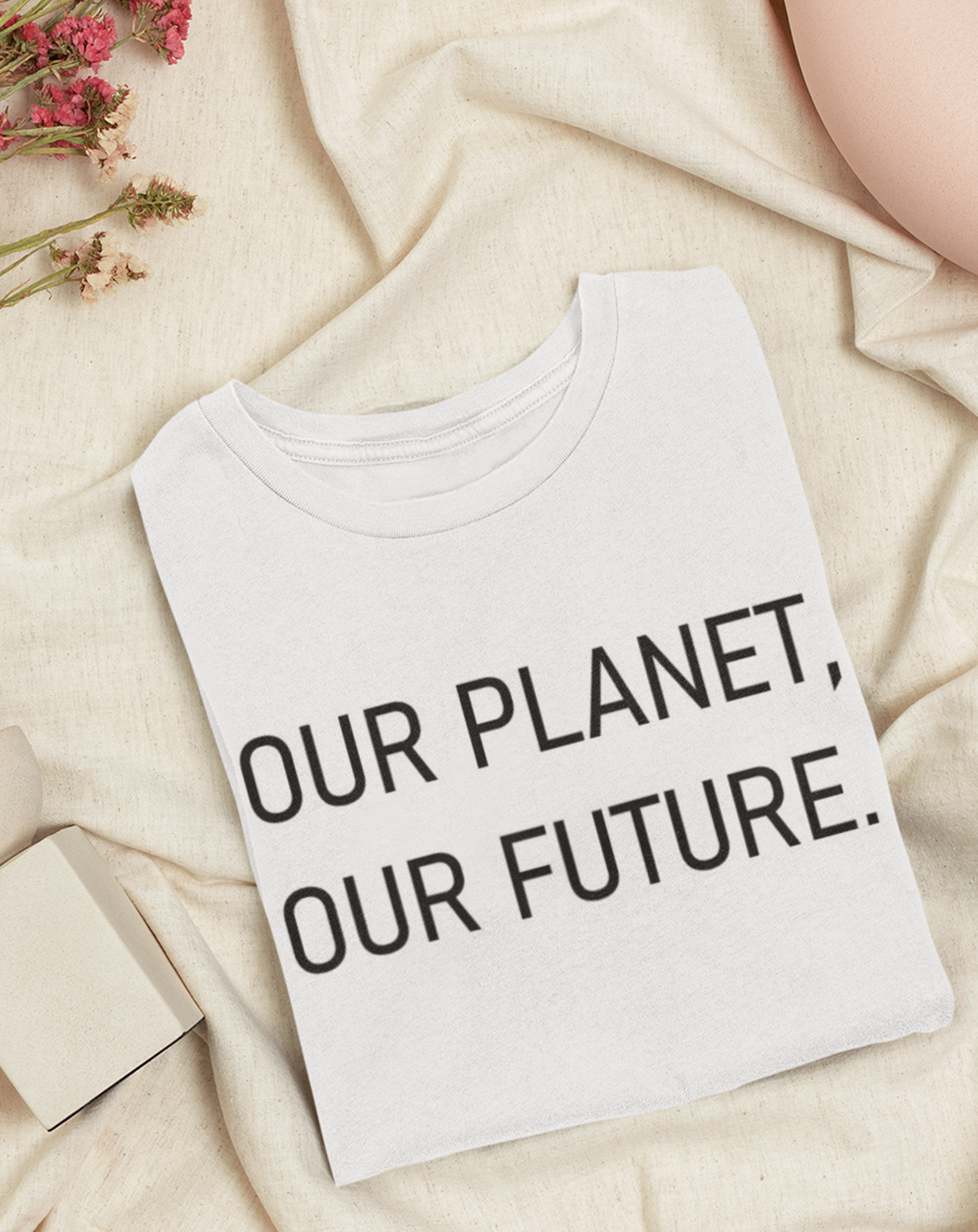 White organic cotton T-shirt with Our Planet Our Future slogan. Wear and share your beliefs with this Shirty Slogan T-Shirt. One-size (designed to be worn large!) and unisex, our t-shirts are for people who are proud to stand up for what they believe in.